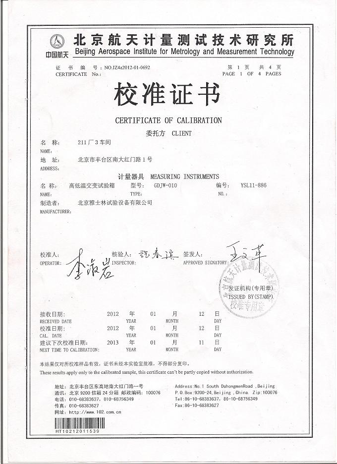 >>高低溫交變?cè)囼?yàn)箱校準(zhǔn)證書(shū)-航天計(jì)量-航天一院