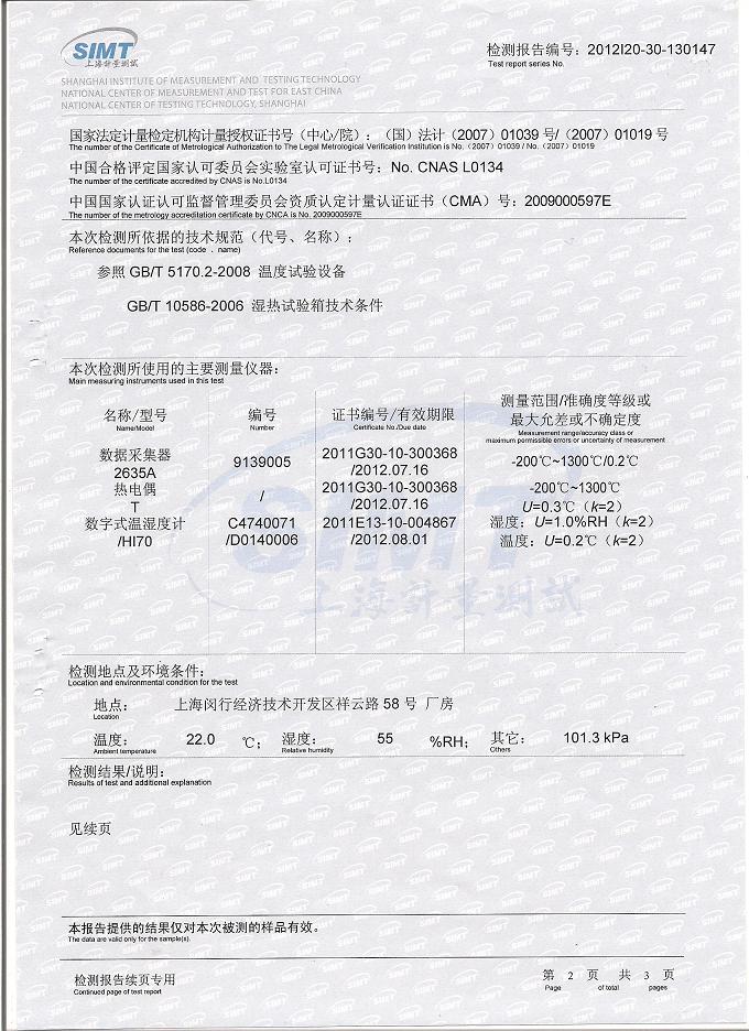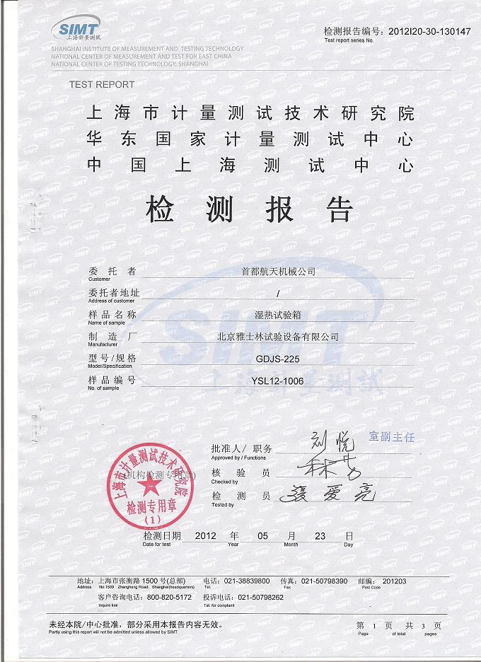 >>高低溫交變濕熱試驗箱檢測報告-上海計量院-首都航天