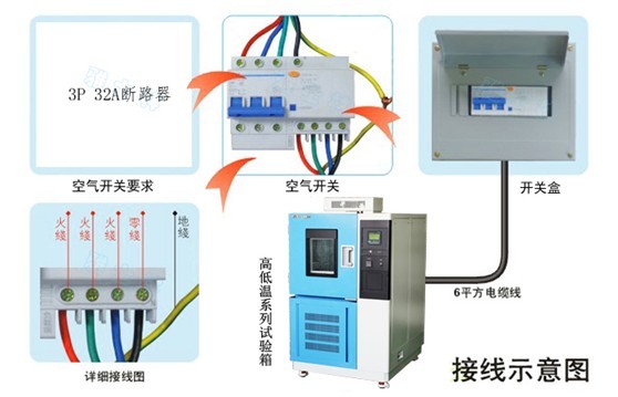 高低溫試驗(yàn)箱的電源要求是AC380V±10% 50±0.5Hz 三相五線制,并要求用戶在安裝現(xiàn)場(chǎng)為設(shè)備配置相應(yīng)容量的空氣或動(dòng)力開關(guān),并且此開關(guān)必須是獨(dú)立供本設(shè)備使用(建議電源開關(guān)容量:32A),其具體接線方式如下: