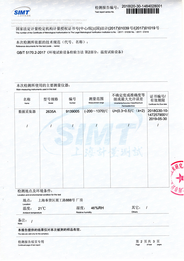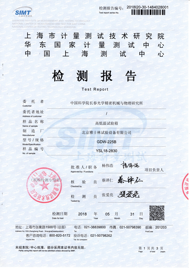 高低溫試驗(yàn)箱在首次投入使用前,應(yīng)對可反映設(shè)備性能的相關(guān)參數(shù)進(jìn)行詳細(xì)確認(rèn)及測試,在日常使用中則應(yīng)依據(jù)所使用的試驗(yàn)方法進(jìn)行對試驗(yàn)參數(shù)的要求,需確認(rèn)其性能是否滿足試驗(yàn)參數(shù)的要求。更多的用戶會(huì)選擇由第三方檢測機(jī)構(gòu)進(jìn)行檢測,并出廠檢測報(bào)告,如下: